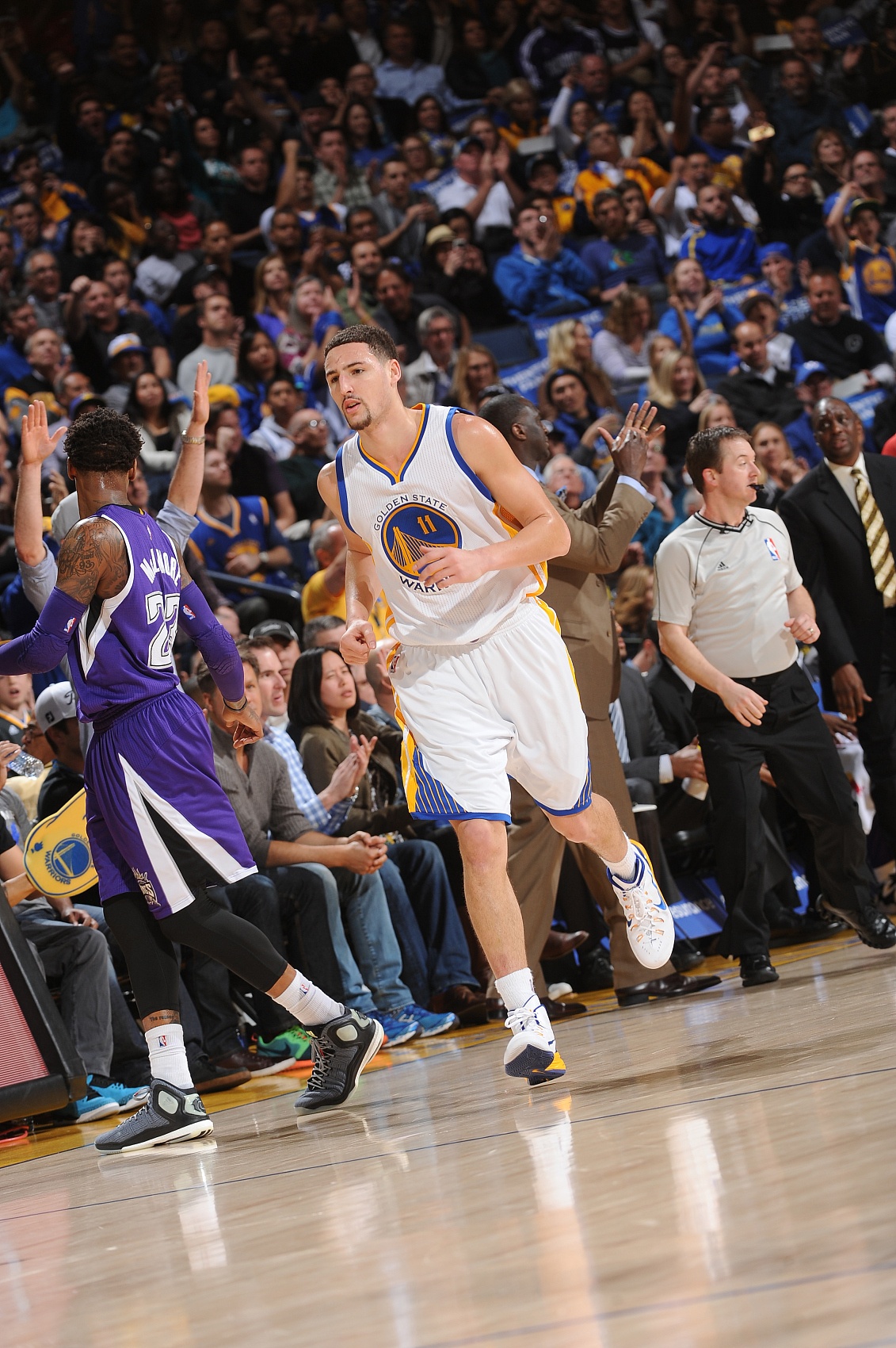 当时那场比赛,勇士以126-101大胜国王,克莱全场出战32分49秒,投篮25中16,三分15中11,罚球10中9,得到52分2篮板5助攻4抢断2盖帽。